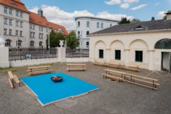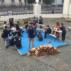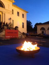 Zentral im Hof des Kunstvereins ist eine Feuerstelle angelegt, die zu bestimmten Gelegenheiten aktiviert wird: Dann knistert das Lagerfeuer, es wird gemütlich, es wird geredet, gekocht und getanzt. Jede und jeder darf Platz nehmen auf Bänken, die in einer variablen Anordnung ringsum stehen. Die Feuerstelle hat ihren Platz auf einem Betonsockel, der dem Grundriss eines Raumes in der Remise entspricht. Jener fungierte zur Entstehungszeit des Ensembles der Villa Salve Hospes und ihrer Nebengebäude ebenso wie aktuell für die ortsspezifische Installation von projektKLUB als Lager: Hier wird Equipment aufbewahrt, das im Rahmen der sogenannten „Ereignisse“ zum Einsatz kommt. Zusätzlich ist im Foyer (frz. = Herd, Brennpunkt, über das Vulgärlateinische zu lateinisch focus = Feuerstätte, Herd) der Villa das Holz gestapelt, welches es für das Feuer im Hof braucht. Der erste Ort des Willkommens ist – umso einladender – nach draußen verlagert: keine Tür versperrt mehr den Zutritt und schließt ein oder aus. Schlicht gesagt, geht es bei der für Groups entwickelten Arbeit von projektKLUB um Begegnungen, um ihr Potential und ihre Notwendigkeiten. Im selben Augenblick spiegelt das Konzept dieser Räume verbindenden Installation die Struktur, Dynamik und Arbeitsweise der Gruppe, die als offenporiges Kollektiv zusammenarbeitet wider. Es gibt keinen definitiven, exklusiven Kreis an beteiligten Personen, aber einen festen Stamm an Künstler_innen, die von Projekt zu Projekt neu entscheiden, ob sie mitwirken oder nicht. Das ist eine nicht nur praktikable Antwort auf Fragen, die sich Kunstschaffende in der Schere zwischen Ökonomie und Idealismus vor allem im Anschluss an ihre Ausbildung stellen müssen. Zudem agiert projektKLUB aus einer gleicher-maßen romantischen wie politischen Haltung heraus: „Aus dem, was uns in der Liebe so selbstverständlich vorkommt, können wir etwas für unsere politischen Ziele lernen. Denn letztlich geht es bei beidem um gegenseitige Anerkennung, Interaktion und Vereinigung.“ (Margarete Stokowski: Untenrum frei,